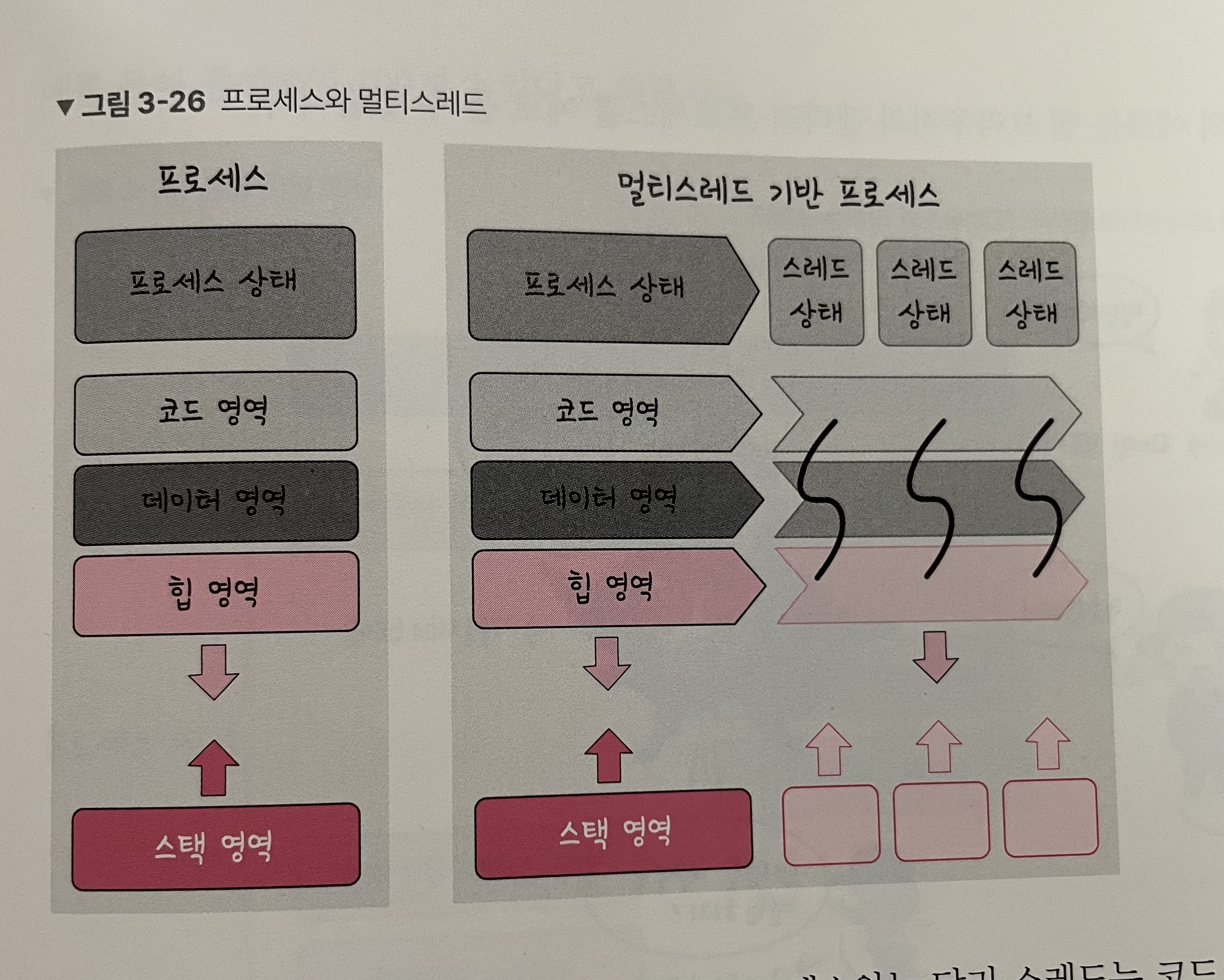 아래 이미지는 ‘3장.운영체제’에 있는 것으로 프로세스와 스레드의 차이, 프로세스와 스레드는 어떻게 각각 어떤 데이터를 공유하고 어떤 데이터는 각각 사용되는지에 알려준다.
