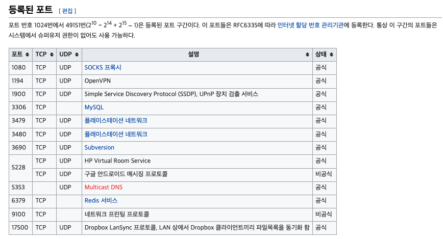 https://ko.wikipedia.org/wiki/TCP/UDP%EC%9D%98_%ED%8F%AC%ED%8A%B8_%EB%AA%A9%EB%A1%9D