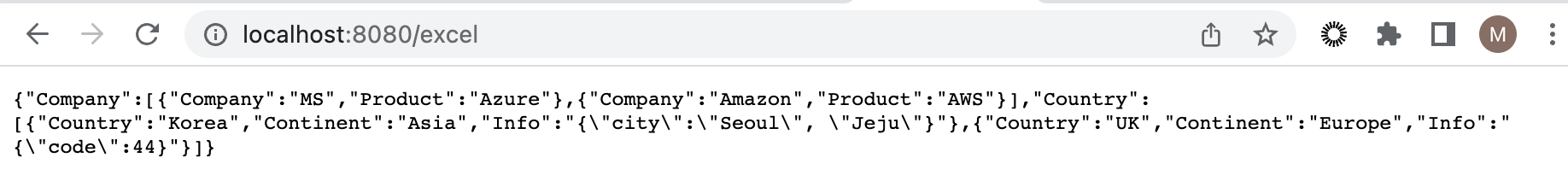 express app을 실행시킨 후 http://localhost:8080/excel 에 접속시 응답 값으로 내용을 확인할 수 있다.